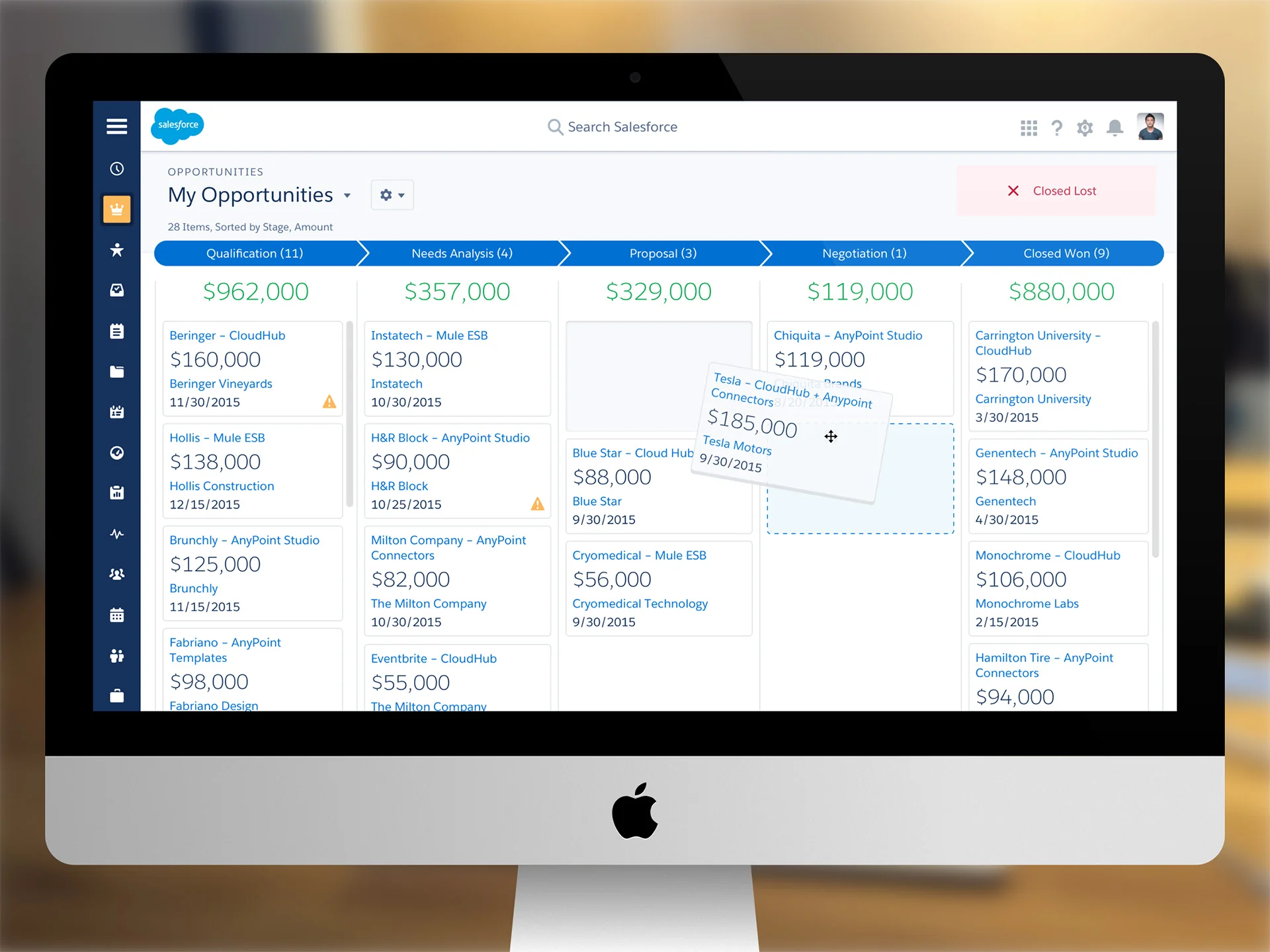 After iterating on new ways to show and manage opportunities, one particular version resonated most strongly with customers. Opportunity Kanban takes inspiration from agile workflows and modern project management tools to provide an out-of-the-box overview of active sales deals. It allows users to drag and drop deals as they progress, and shows a simple calculation of how much potential revenue is coming in from the pipeline. It also flags deals that need attention, enabling sales reps to stay on track.
